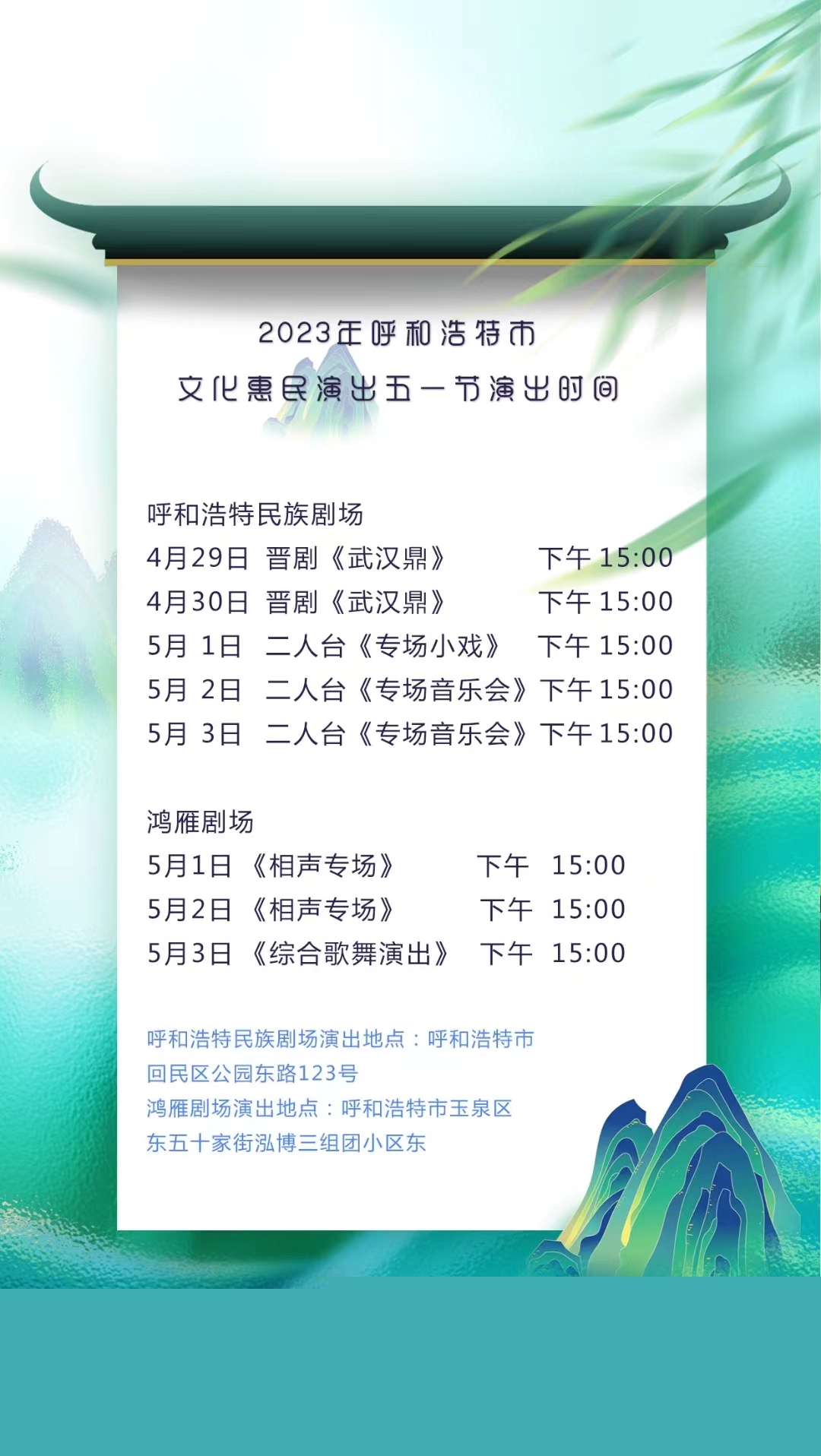 ? ? 五月繁花似錦,綠蔭如海,春意盎然。即將迎來五一小長假,還在為擁擠的景區(qū)而煩惱嗎?還在為假期去哪兒而猶豫不決嗎?別急,五一期間,2023年呼和浩特市文化惠民演出來啦!