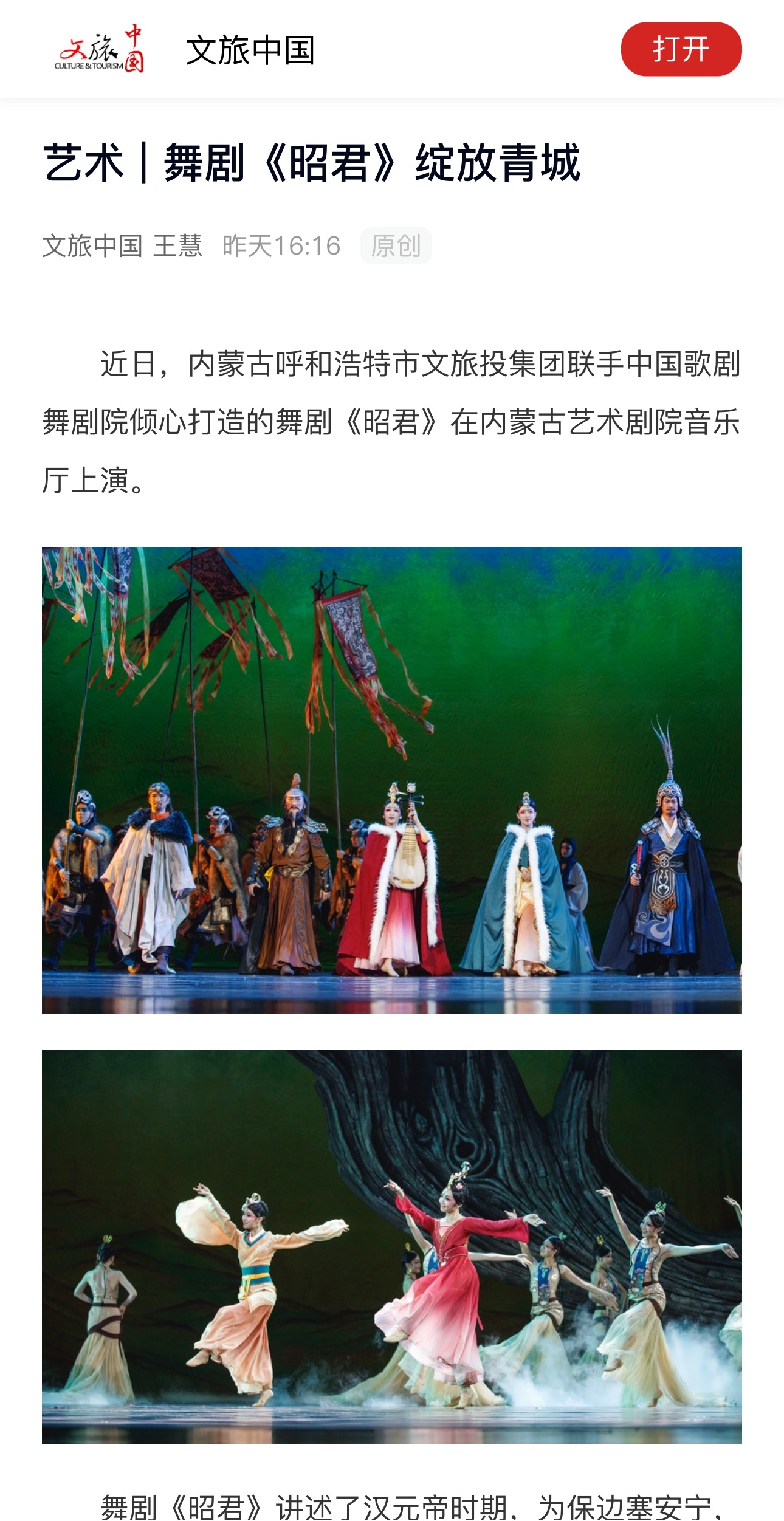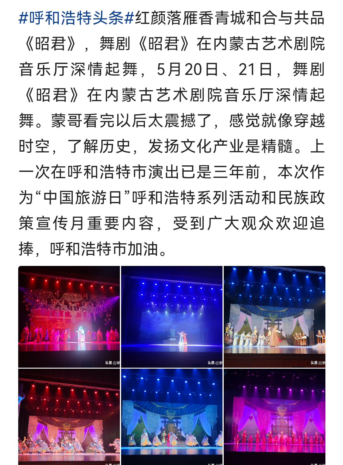 ? ? 演出同時(shí)得到了新聞媒體、社會(huì)各界的廣泛關(guān)注,央視新聞、人民網(wǎng)、文旅中國、內(nèi)蒙古新聞聯(lián)播、日?qǐng)?bào)、融媒體等多家新聞媒體聚焦關(guān)注,今日頭條、抖音等網(wǎng)絡(luò)博主紛紛刊發(fā)觀后感“太震撼”“呼市作為歷史文化名城,昭君出塞的故事從小就是呼市人的文化記憶”“值得一看,希望呼市有越來越多很贊的文藝作品”。
